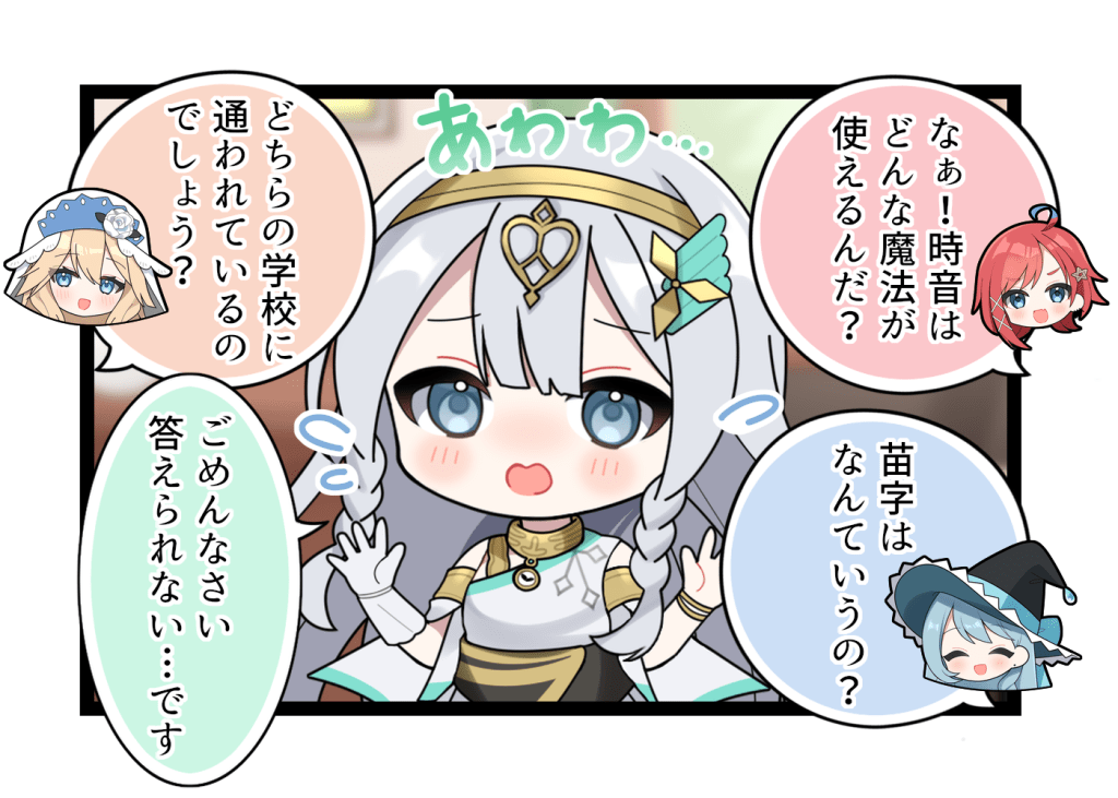 名前以外の事をほとんど教えてくれない時音。他の魔法少女たちからの質問攻めに、どう対応すればよいか分からずパニックに陥る。